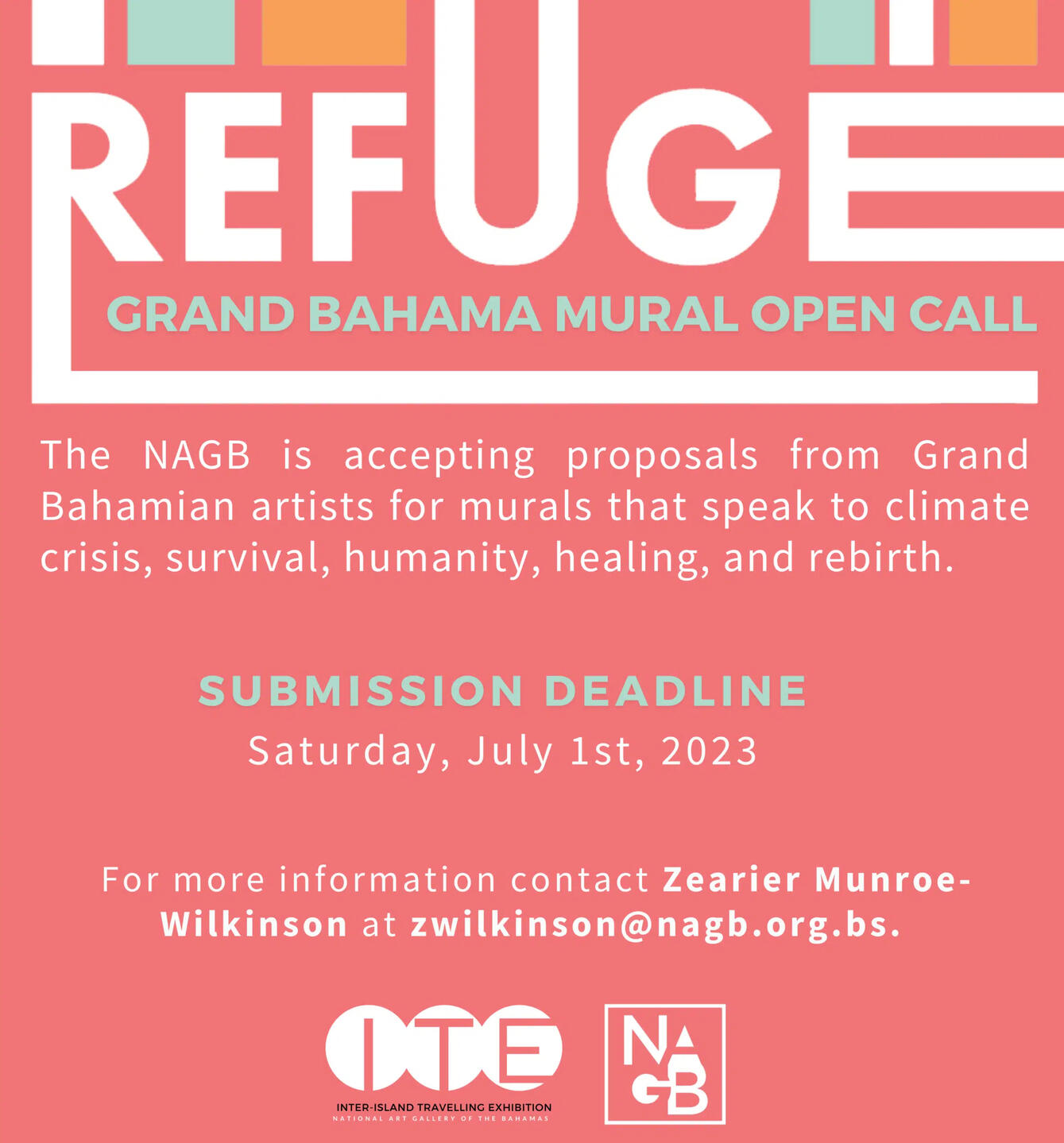 As an accompaniment to this exhibition, the NAGB will be unveiling a mural in Grand Bahama as a part of the wider ITE programming. To this end, the NAGB invites residents and/or native Grand Bahamian artists to submit proposals to create a mural that comments on the indomitable Bahamian spirit through the lens of climate crisis. The mural created should allow onlookers to reflect on the catalysts and outcomes of existing in our status as a small island developing state in the context of global climate crisis. It should speak to healing, survival, humanity, and rebirth. Ideally, it will also spark discussions on the importance of preserving and sharing our history, culture and traditions with future generations as an invaluable educational tool.
